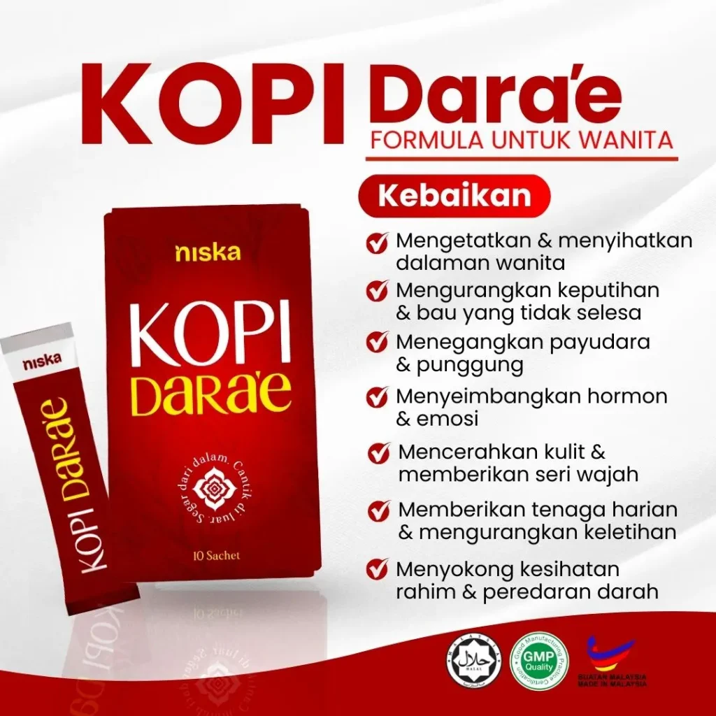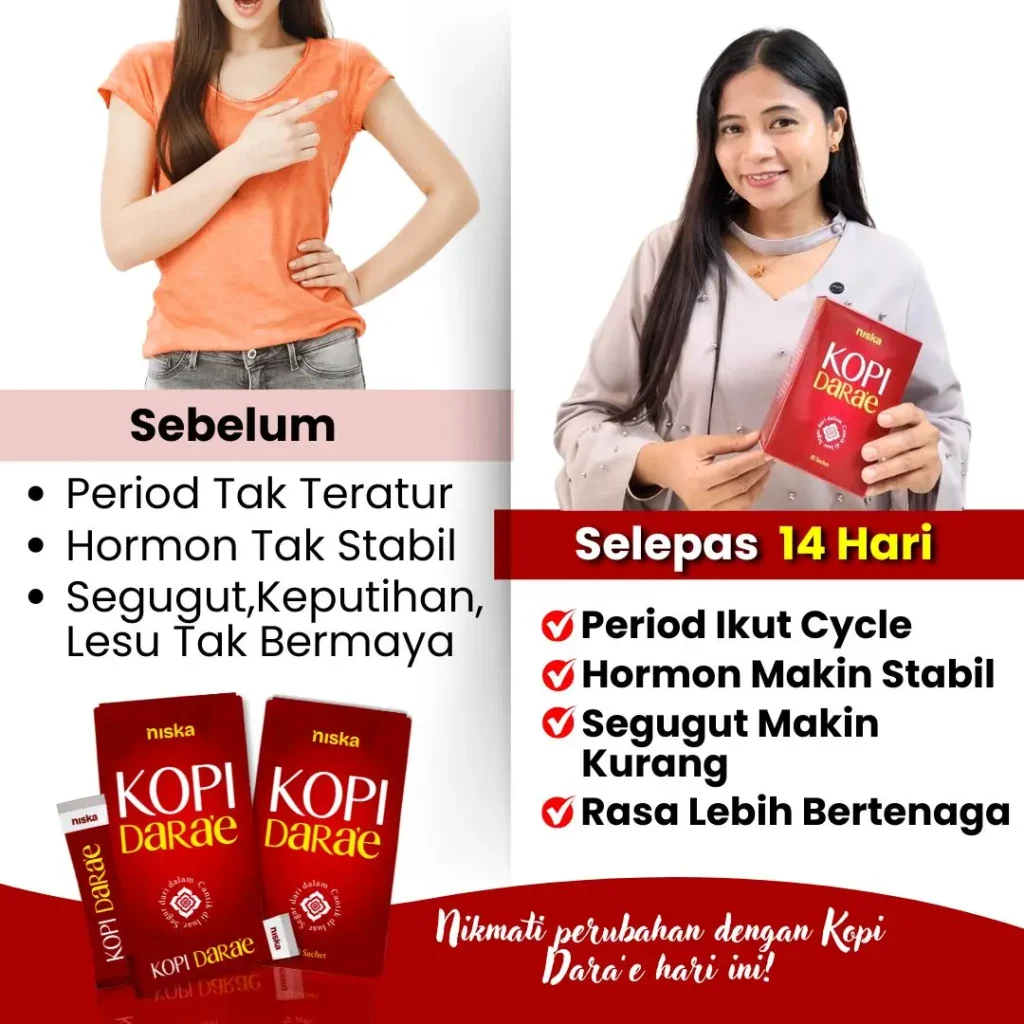 Kopi Darae diformulasi khas untuk membantu wanita yang mengalami masalah keintiman, hormon tak stabil, haid tak teratur, payudara kendur, keputihan, lesu, dan kurang nafsu. Ia bantu tingkatkan kesihatan dalaman secara semula jadi.