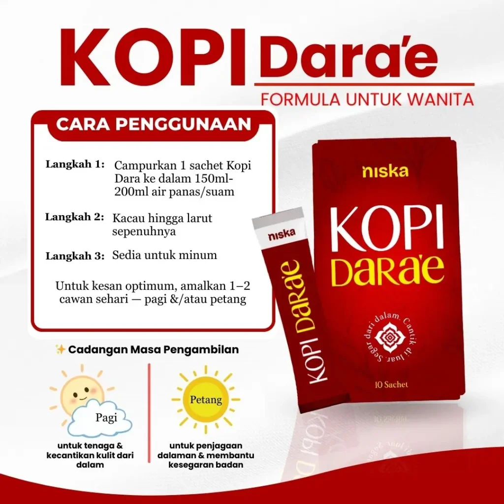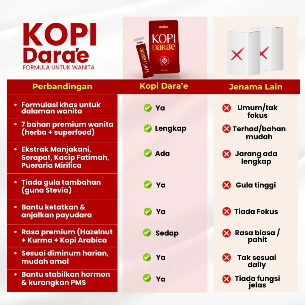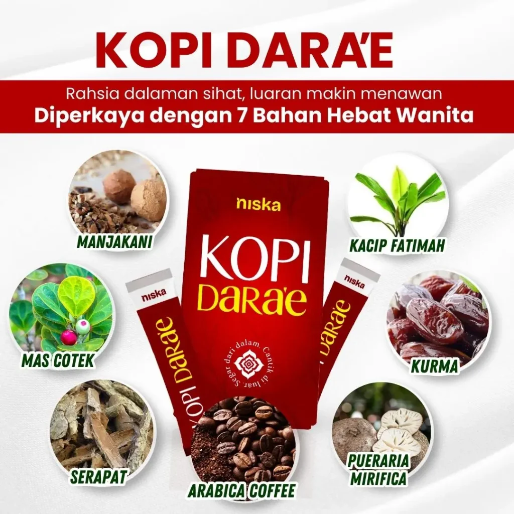 Kopi Darae diformulasikan dengan gabungan kopi Arabica premium dan herba wanita terbaik – Manjakani, Kacip Fatimah & Pueraria Mirifica – kaya dengan khasiat untuk kesihatan dan keyakinan dalaman