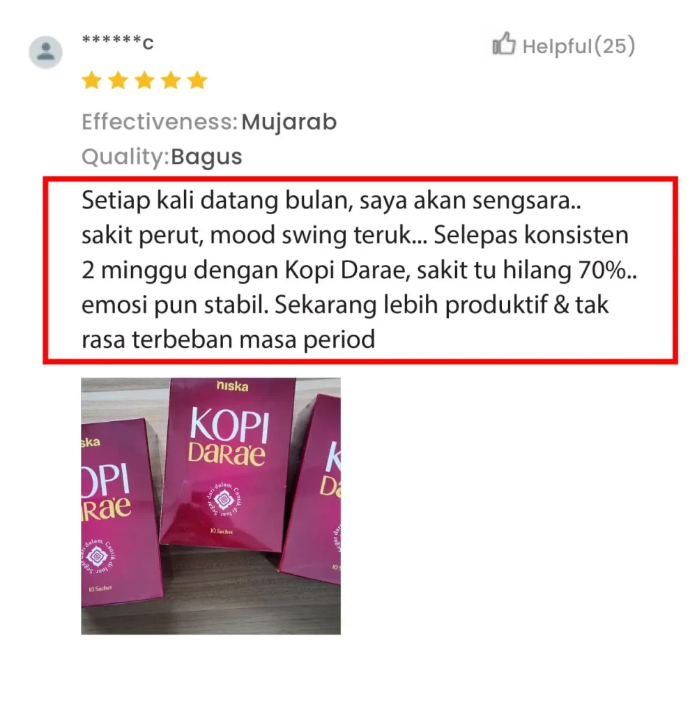 Semasa period, boleh teruskan minum Kopi Darae seperti biasa kecuali hari pertama jika ada alahan atau senggugut teruk. Tapi kalau tiada masalah, teruskan seperti biasa.