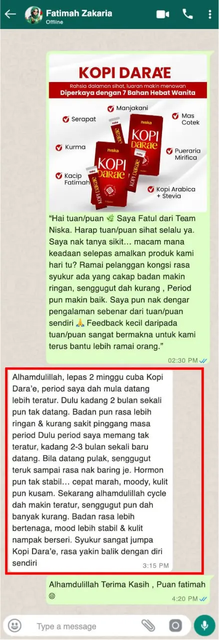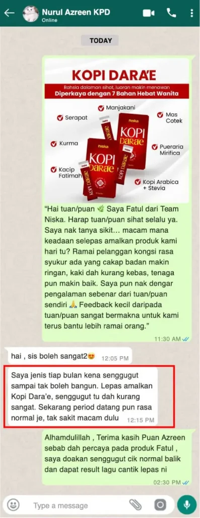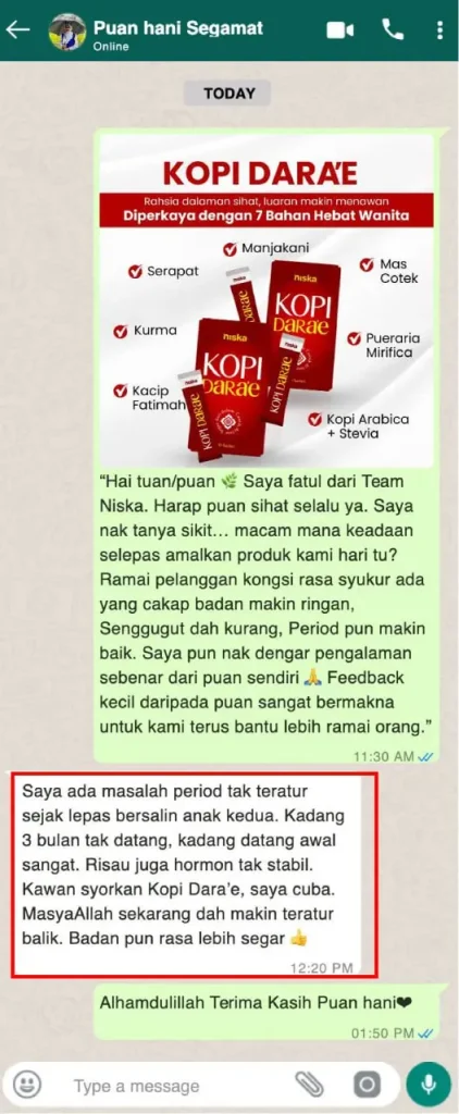 Ramai wanita alami masalah ni diam-diam. Sebab tu kami hasilkan Kopi Darae – minuman herba premium khas untuk wanita moden yang nak pulih tenaga, stabil hormon & cantikkan dalaman dari dalam.